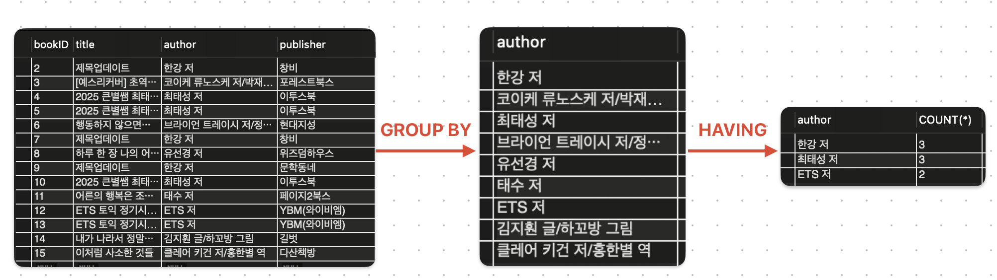예) SELECT author, COUNT(*) FROM Books GROUP BY author HAVING COUNT(*) >= 2;