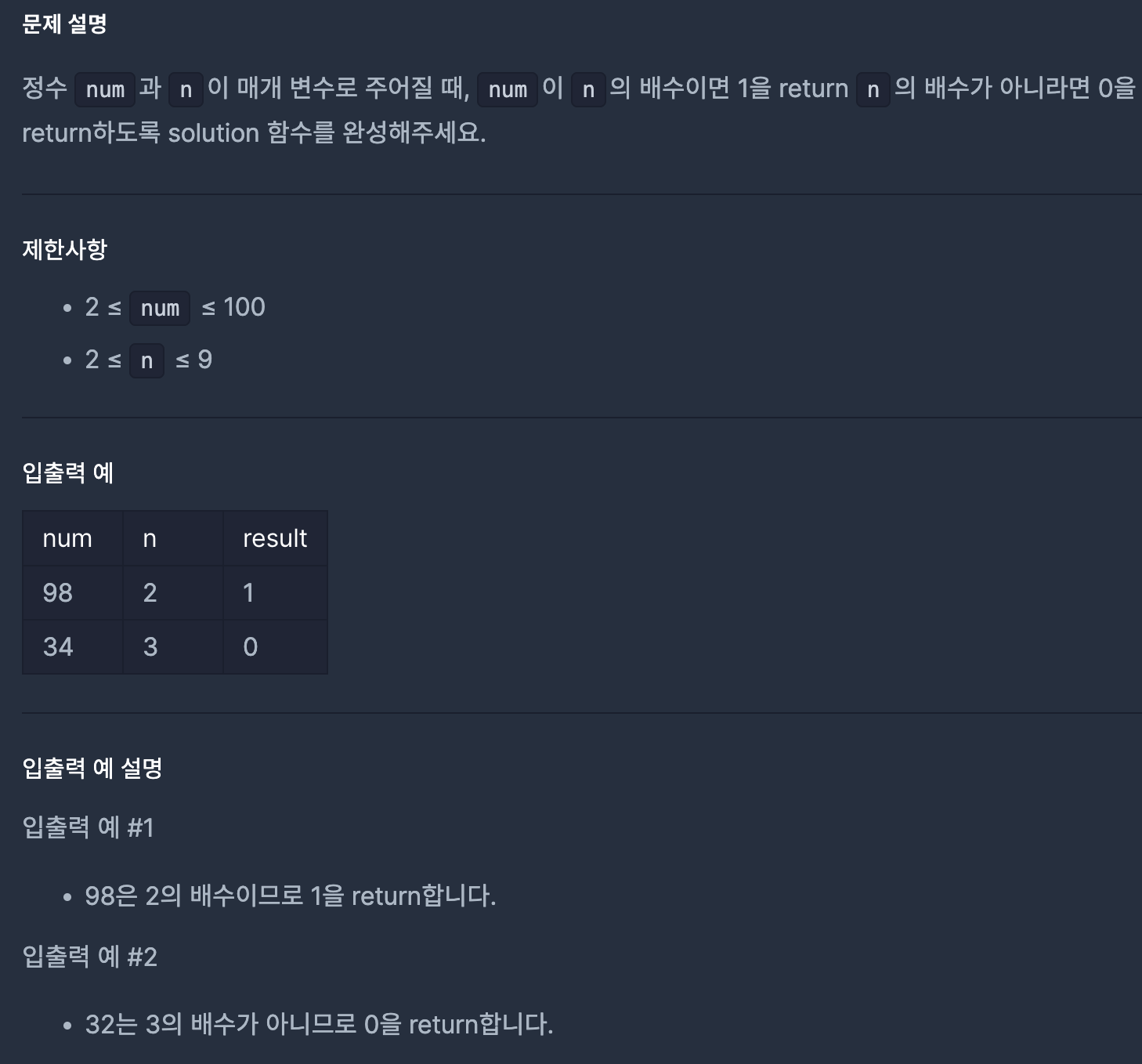 · num이 n의 배수이려면 num을 n으로 나누었을 때 나머지가 0이여야 한다.