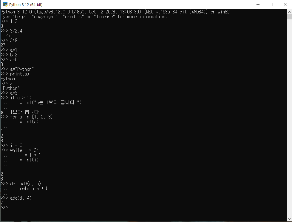 "1+1"을 입력하니 "2"라는 결과값이 바로 출력됩니다. 이렇게 입출력이 번걸아 이어지는 것이 마치 대화하는 것처럼 느껴지기 때문에 '파이썬 대화형 인터프리터"라고 부릅니다.