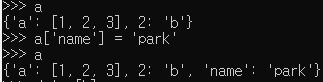 2. Key에는 리스트는 쓸 수 없습니다. 리스트는 그 값이 변할 수 있기 때문에 Key로 쓸 수 없습니다. 단, 튜플은 Key로 쓸 수 있으며, Value에는 변하는 값이든, 변하지 않는 값이든 아무 값이나 넣을 수 있습니다. 리스트도 넣을 수 있습니다.