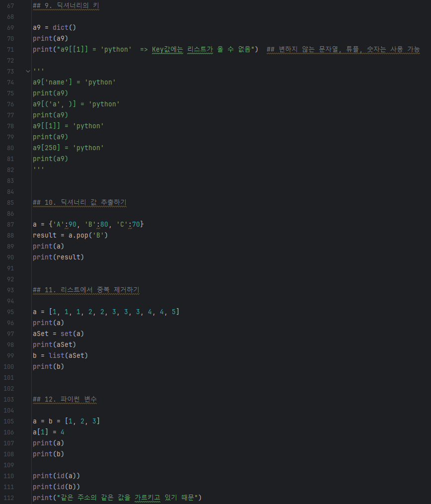 | 딕셔너리 | {Key: Value} | X | X | X | O | * 리스트나 튜플처럼 순서가 없음, 요솟(위치)값이 아닌 Key를 통해 Value를 구함 * 따라서, 인덱싱/슬라이싱 방법을 적용할 수 없음 * Key 중복 안 됨 (나머지 무시) * Key는 변하지 않는 값, Value는 변하는 값이든 변하지 않는 값이든 상관없음 |