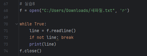 1. readline() : 가장 첫 번째 줄이 화면에 출력됩니다. 더 이상 읽을 줄이 없을 경우, 빈 문자열('')을 리턴합니다. 따라서, 반복문을 나갈 때 "if not line: break" 와 같이 break를 수행하여 빠져 나갈 수 있습니다.