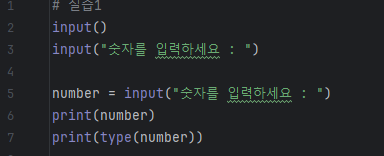 input은 사용자가 키보드로 입력한 모든 것을 문자열로 저장합니다. input()의 괄호 안에 안내 문구를 입력하여 프롬프트를 띄워 줄 수도 있습니다. 그리고 input은 입력되는 모든 것을 문자열로 취급해줍니다. 따라서, 숫자를 입력해도 숫자가 아닌 문자열이라는 것에 주의합시다!