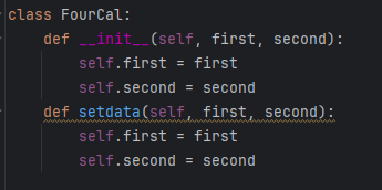 단, 메서드의 첫 번째 매개변수에 "self"가 있습니다. self에는 "setdata" 메서드를 호출한 객체 "a"가 자동으로 전달됩니다. 파이썬 메서드의 첫 번째 매개변수 이름은 관례적으로 "self"를 사용합니다. 물론 "self" 말고 다른 이름을 사용해도 상관없습니다.