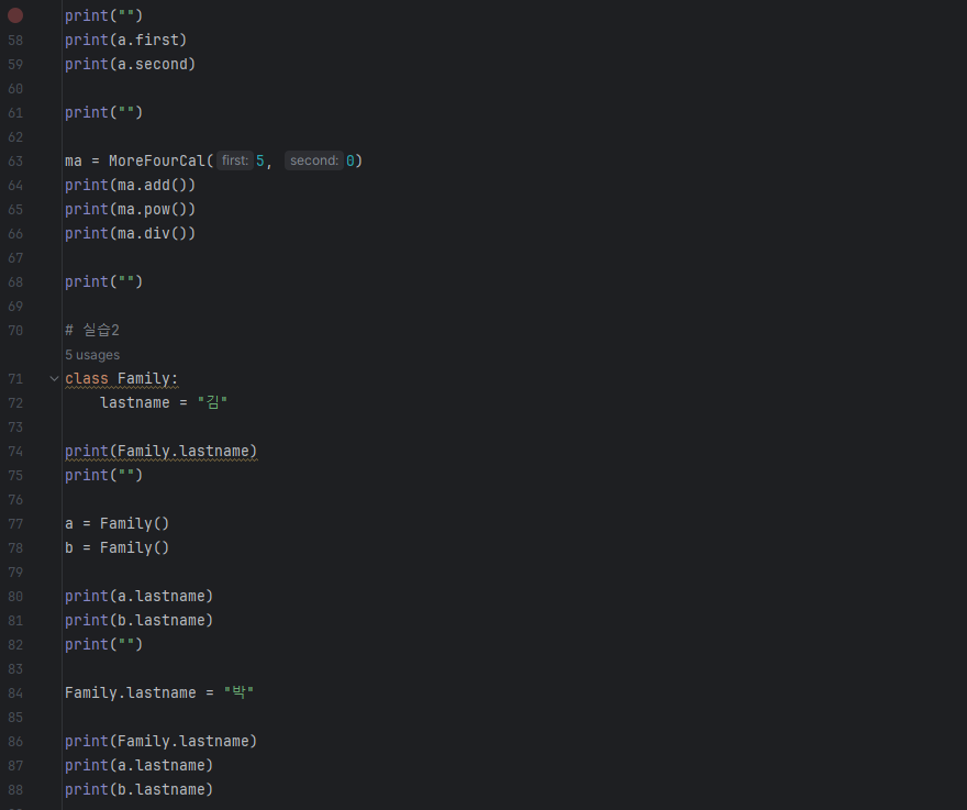 * 클래스로 만든 객체의 객체변수는 다른 객체의 객체변수에 상관없이 독립적인 값을 유지합니다. 즉, a 객체의 객체변수 값을 를 변경해도 b 객체의 객체변수 값에 영향을 주지 않습니다. (변하지 않습니다!)
