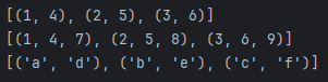 zip(*iterable) : 동일한 개수로 이루어진 데이터들을 묶어서 리턴합니다.