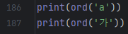 ord(c) : 문자의 유니코드 숫자 값을 리턴합니다. 즉, chr 함수와 반대로 동작합니다.