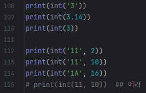 int(x) : 문자열 형태의 숫자나 소수점이 있는 숫자를 정수로 리턴하는 함수입니다.