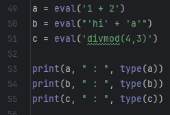 eval(expression) : 문자열로 구성된 표현식을 입력으로 받아 해당 문자열을 실행한 결괏값을 리턴하는 함수입니다. 각 형식에 맞게 type이 정해집니다.