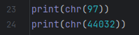 chr(i) : 유니코드 숫자 값을 입력받아 그 코드에 해당하는 문자를 리턴합니다.