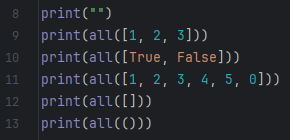 all(x) : 반복 가능한 데이터 x를 입력값으로 받으며, x의 요소가 모두 참이면 True, 거짓이 하나라도 있으면 False를 리턴합니다. (* 반복가능한 데이터 : for 문에서 사용할 수 있는 자료형을 의미합니다. 리스트, 튜플, 문자열, 딕셔너리, 집합 등이 있습니다.)