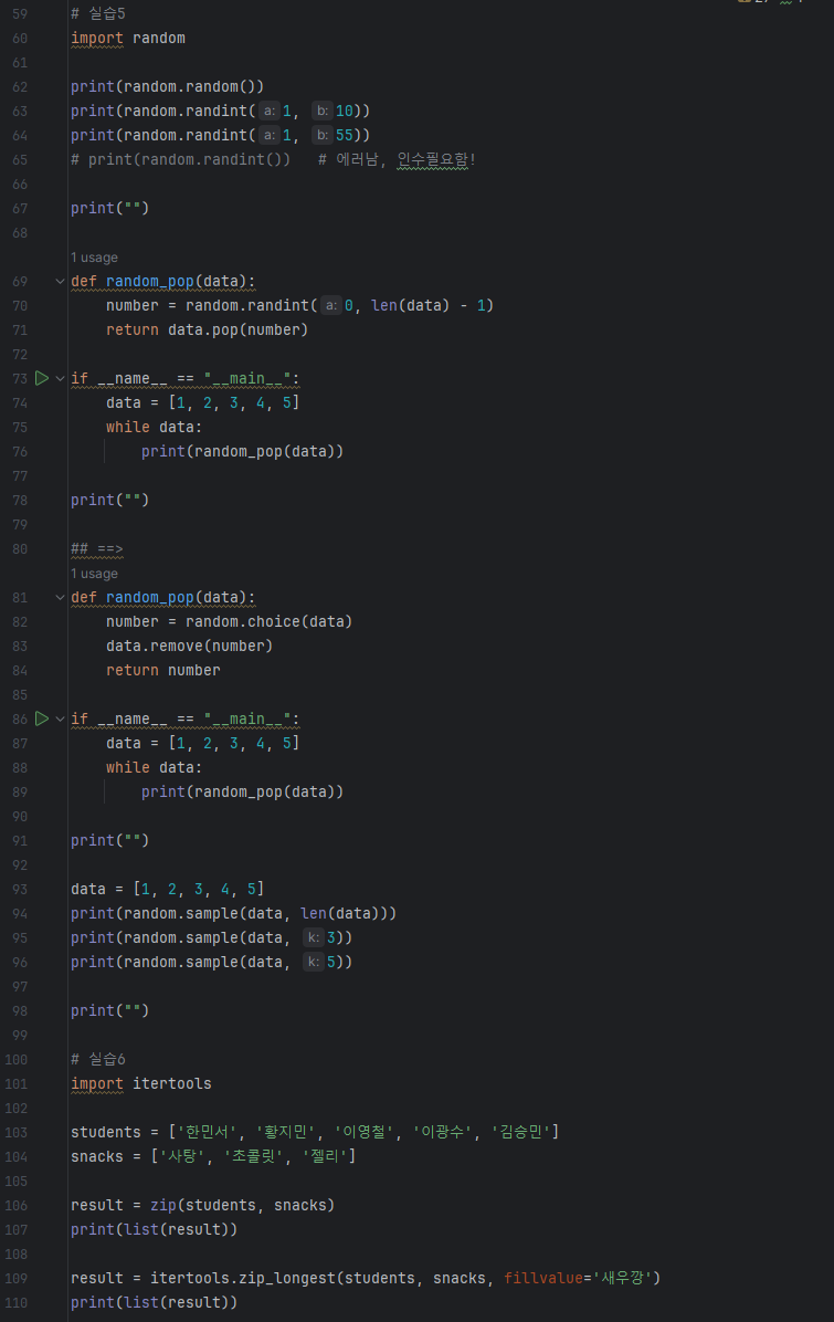 | sample() | 리스트의 항목을 무작위로 섞고 싶을 때 사용. | |